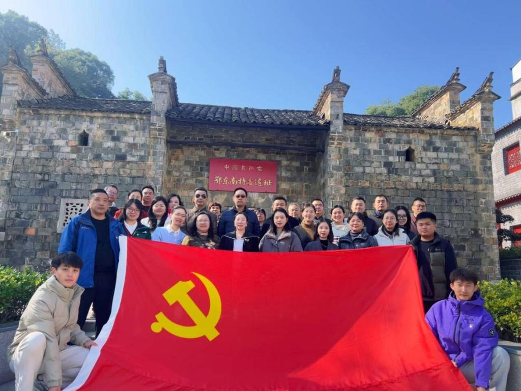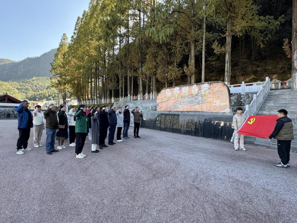 随后,全体党员前往红军村实地参观。行走在革命旧址之间——鄂东南特委机关、红军医院、彭德怀故居、列宁学校等,厚重的历史感扑面而来。简陋的居所、朴素的设施,无声地诉说着当年革命条件的艰辛与共产党人乐观向上的精神风貌。在红军烈士纪念碑前,全体党员整齐列队,面对鲜红的党旗,重温入党誓词。铿锵有力的誓言在山谷间回荡,表达了师范学院全体党员不忘初心、牢记使命,为党的教育事业奋斗终身的坚定决心。